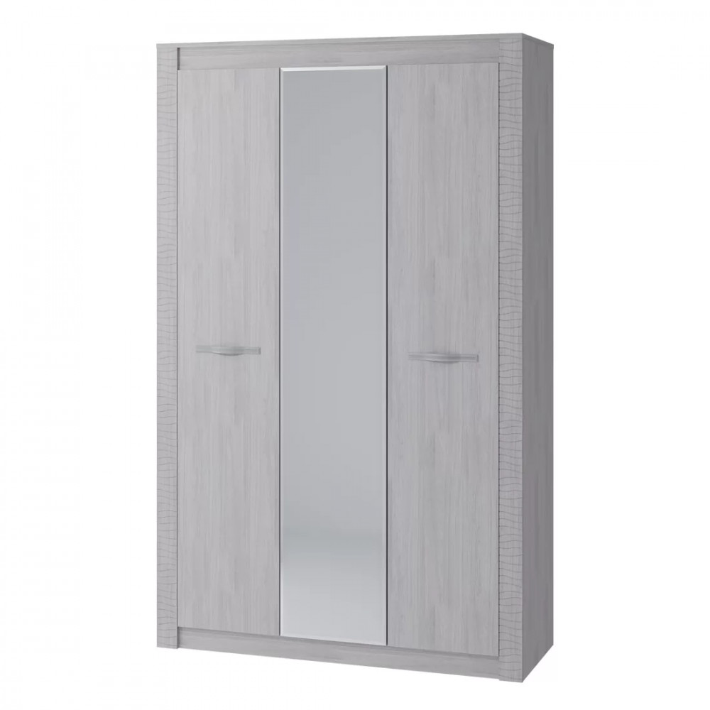 -модель не имеет вычурного декора и лишних деталей, выполнена в сдержанном и лаконичном стиле, -комплектация шкафа представляет собой несколько полок для хранения вещей в сложенном виде, а также отделение с -хромированной штангой для одежды на вешалках, -для создания модели используется качественная ЛДСП цвета белого ясеня, -центральная створка является полностью зеркальной, две остальные дополнены изящными ручками.