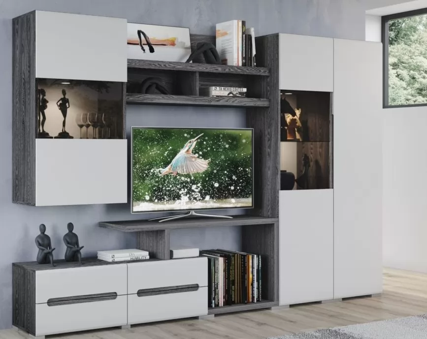 Фасады МДФ под пленкой ПВХ, петли с доводчиком. Особенностью серии является интегрированная ручка, которая придает гостиной индивидуальность и практичность.