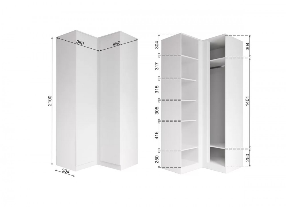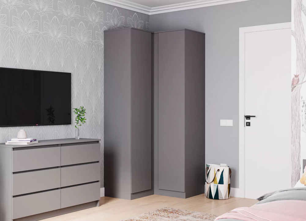 Угловой шкаф, позволяющий эффективно использовать пространство комнаты. Внутреннее наполнение включает удобные полки для хранения одежды и аксессуаров.