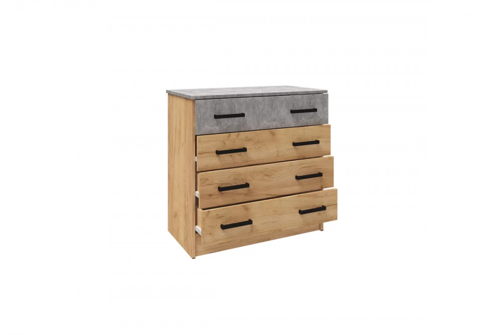 Высота, мм: 810 Ширина, мм: 820 Глубина, мм: 435 Материал корпуса: ЛДСП Материал фасада: ЛДСП Цвет ручки: Черный Материал ручки: Пластик Цвет корпуса: Дуб крафт золотой Цвет фасада: Дуб крафт золотой/ателье светлое Направляющие: Роликовые Количество ящиков: 4