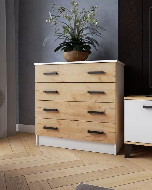 Высота, мм: 810 Ширина, мм: 820 Глубина, мм: 435 Материал корпуса: ЛДСП Материал фасада: ЛДСП Цвет ручки: Черный Материал ручки: Пластик Цвет корпуса: Белый Цвет фасада: Дуб крафт золотой Направляющие: Роликовые Количество ящиков: 4