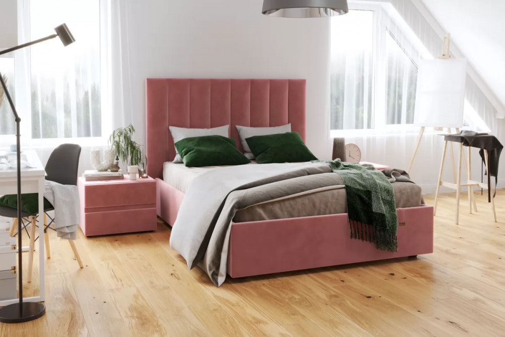 Кровать «Ingrid» подойдет для современных интерьеров спален, впишется в стиль ретро и скандинавский минимализм. Обивка будет отлично сочетаться с любыми цветовыми оттенками отделки и мебели. Кровати выполнены в нейтральных и ярких тканях велюр, что позволяет подобрать подходящий вариант почти под любой интерьер. Изголовье имеет прямоугольную форму, повторяя очертания кровати. Дизайн модели отличается высоким изголовьем с вертикальными строчками и углублениями.