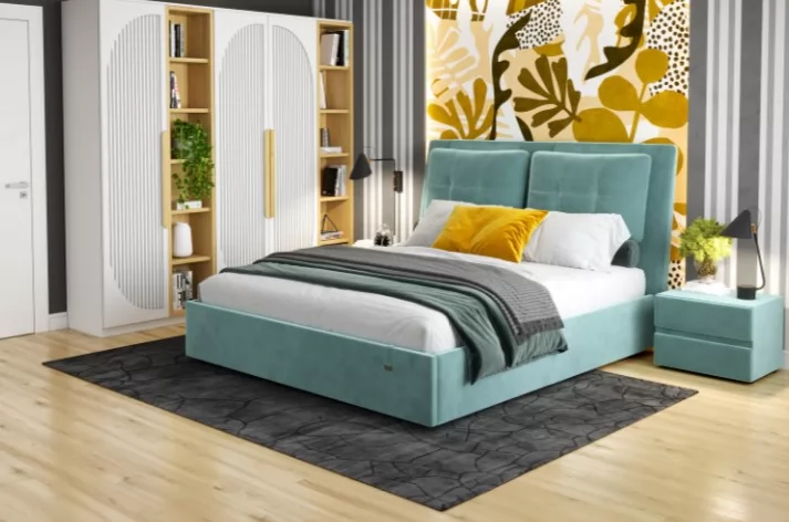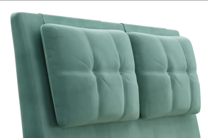 Кровати выполнены в нейтральных и в ярких тканях велюр, что позволяет подобрать подходящий вариант почти под любой интерьер. В качестве декора применяются декоративные подушки на изголовье.