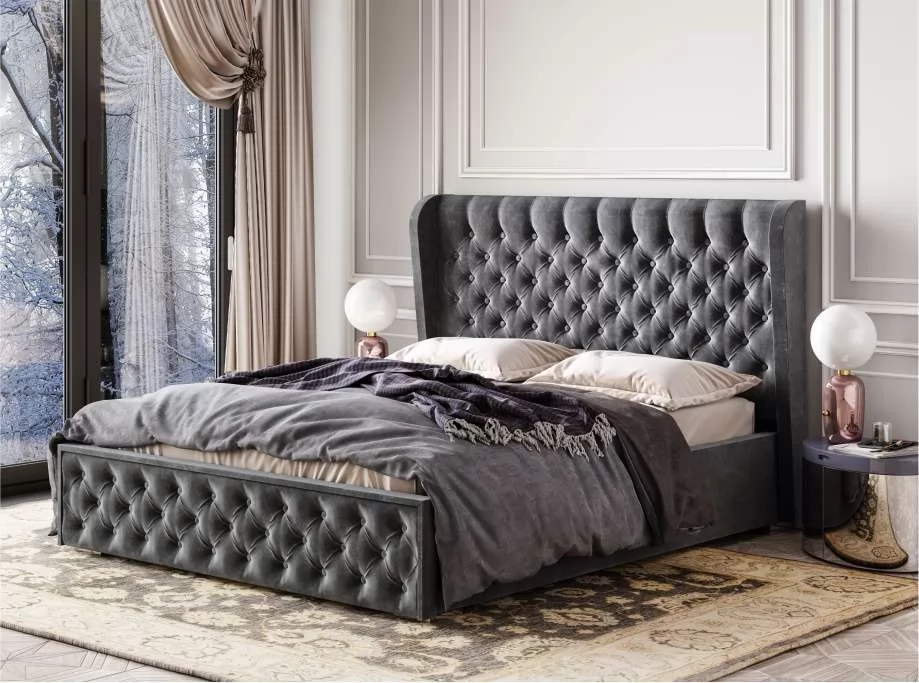 -корпус изделия выполнен из ЛДСП высокого качества, -в дизайне модели используется велюр приятного цвета графит, -высокое мягкое изголовье имеет декоративную стяжку с пуговицами, такой прием придает кровати элегантности.