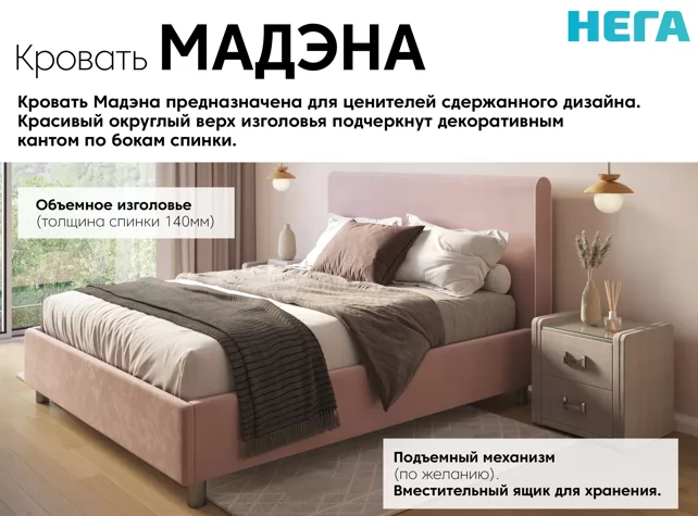 Кровать Мадэна предназначена для ценителей сдержаннного дизайна. Красивый округлый верх подчеркнут декоративным кантом по бокам спинки. Модель хорошо впишется как в лаконичный скандинавский стиль, так и более яркий детальный интерьер, уравновешивая другие элементы обстановки.