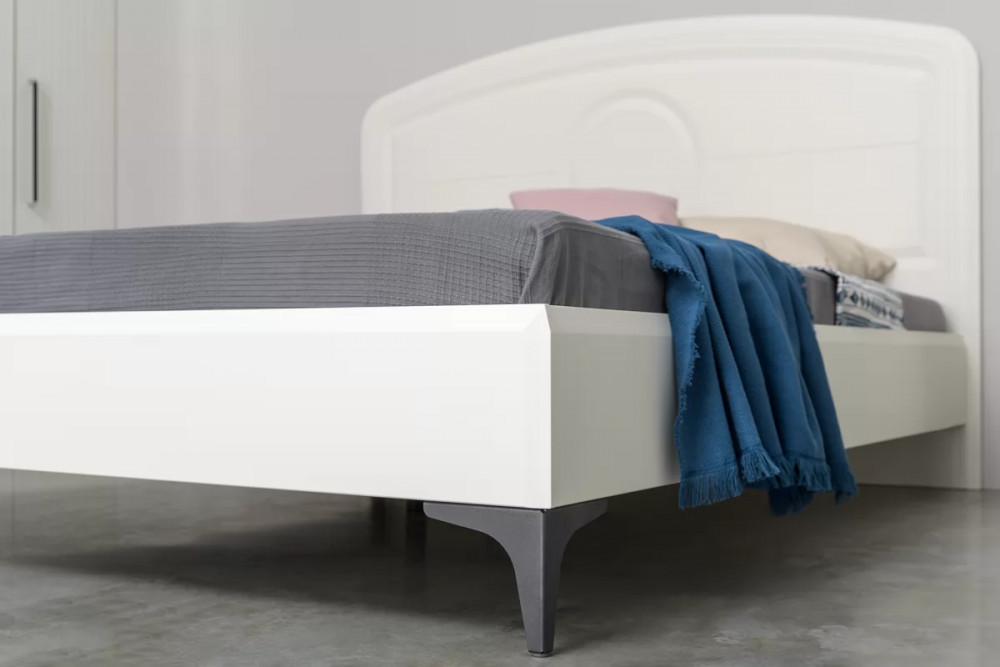 Кровать установлена на высокие ножки, что делает конструкцию лёгкой и воздушной, изголовье кровати декорировано пышным мягким элементом. Матрас укладывается на ортопедическое основание с гнутоклееными ламелями.
