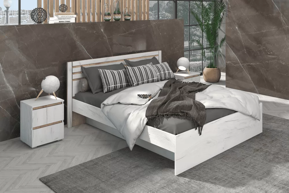 Изящная и функциональная спальня "Лиана" выполнена в модном цвете ЛДСП крафт белый с контрастными вставками цвета графит, либо крафт золотой. Кровать "Лиана" с настилом из ЛДСП рассчитана на нагрузку до 90кг на 1 спальное место.  Матрас в комплектацию кровати не входит и приобретается отдельно