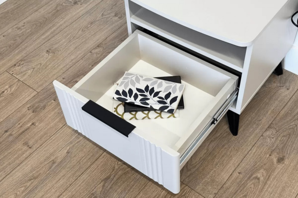 Благодаря компактным размерам тумба легко впишется в любой интерьер и гармонично сочетается с другими модулями спальни «Катрин». Выкатной ящик на шариковых направляющих обеспечивает удобный доступ к вещам, а нерегулируемые пластиковые опоры гарантируют стабильность конструкции.