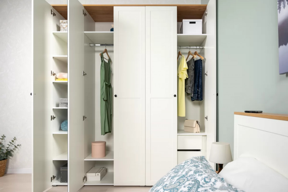 В изголовье кровати предусмотрены вместительные ниши. Шкафная группа полноценной глубины