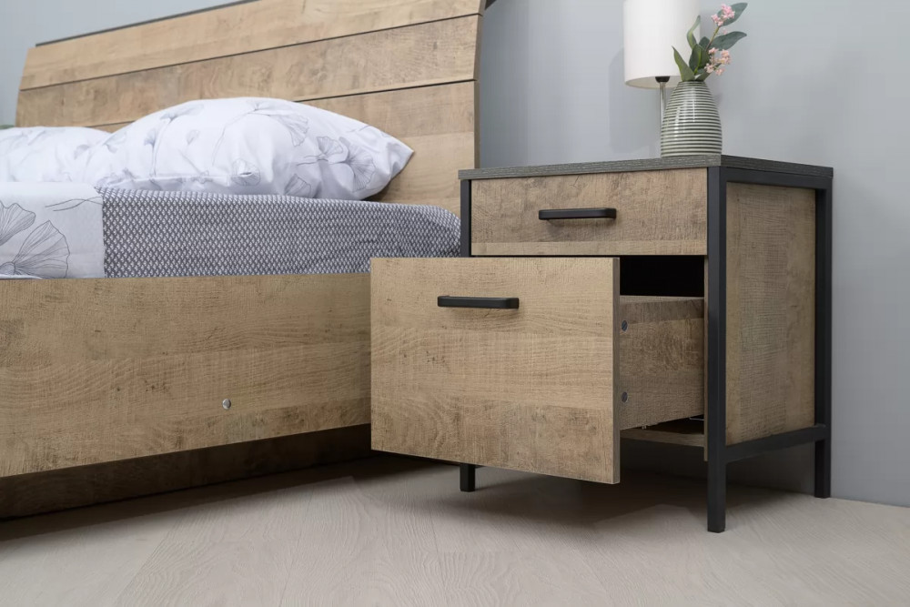 Брутальная спальня в стиле лофт. Кровать оснащена ортопедическим основанием с подъёмным механизмом, который открывает доступ к вместительному коробу для хранения. Металлические опоры делают эту мебель надёжной, аутентичной и функциональной. Лицевая фурнитура с тем же покрытием придаёт мебели индустриальную эстетику. Шкаф со створкой из тонированного стекла является современным и оригинальным решением.