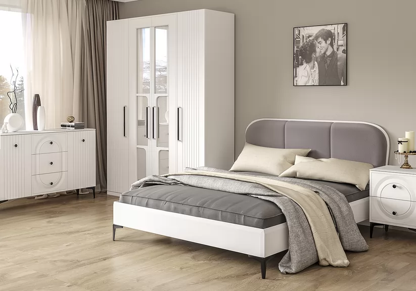 • Фасады выполнены из МДФ с матовой ПВХ-плёнкой. Такое решение делает мебель визуально более "мягкой", комфортной и расслабляющей, что особенно актуально для спальни.