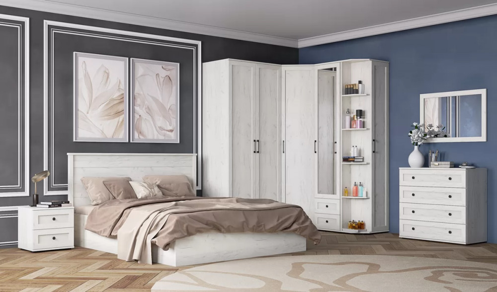 Спальню можно собрать в одном стиле с гостиной. Торцевой шкаф с открытыми и закрытыми полками.
