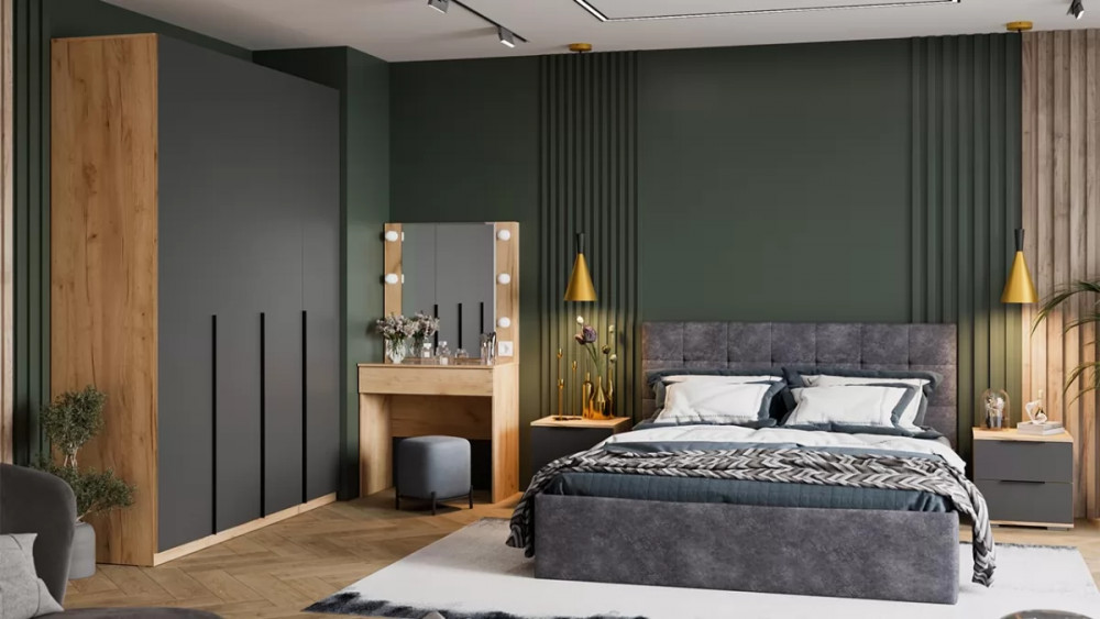 Спальное место - длина: 2 000 Назначение: Мебель для хранения Зеркало: Да Комната использования: Спальня Материал кромки каркаса: ПВХ Стиль: Современный Тип: Спальный гарнитур Расположение: Напольный Тип направляющих ящиков: Шариковые Материал каркаса: ЛДСП Спальное место - ширина: 1 600 Направление открытия двери: Определяется при сборке Материал ручек: Металл Производство: Россия Модель: Джоли Материал фасада: ЛДСП, стекло Цвет: Дуб Крафт золотой, Графит матовый, Микровелюр Wellmart Graphite Наличие механизма раскладки: Нет Наличие спального места: Нет