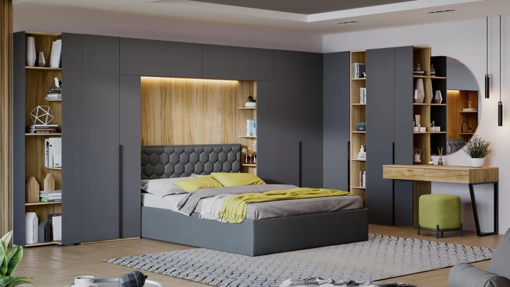 Спальный гарнитур «Порто» №3 Яблоня Беллуно, Графит софт, Велюр Confetti Stone в Советском
