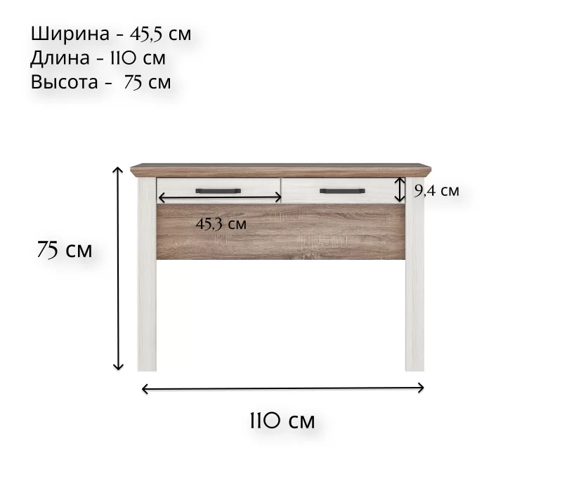Туалетный столик — это функциональная часть интерьера, которая поможет организовать личную зону. Два выдвижных ящика оснащены шариковыми направляющими и удобны в использовании. В них вы можете хранить косметику, аксессуары и средства личной гигиены.
