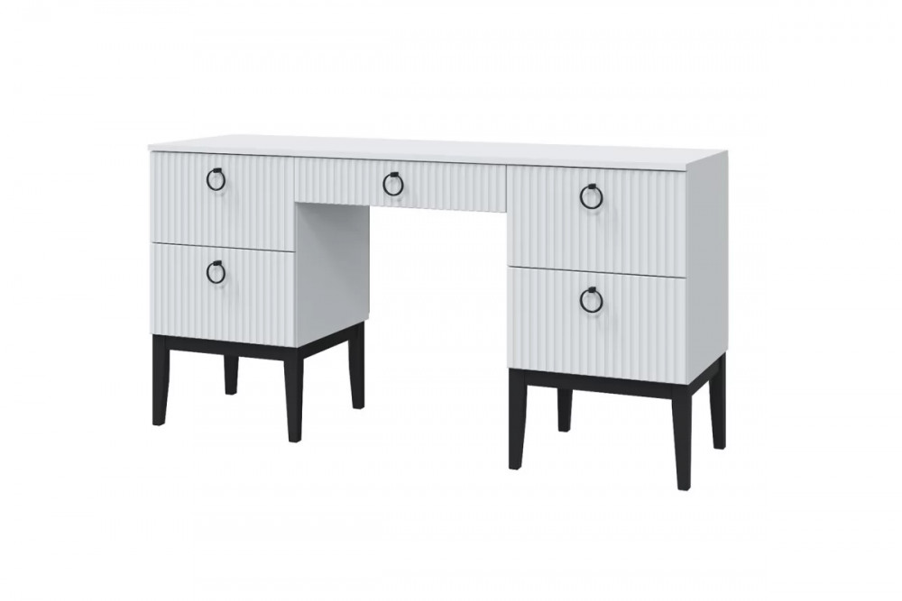Материал ножек, опоры: Дерево Высота, мм: 771 Ширина, мм: 1496 Глубина, мм: 458 Вес, кг: 58.7 Цвет ножек: Черный Материал корпуса: ЛДСП Материал столешницы: ЛДСП Материал фасада: МДФ Цвет корпуса: Белый снег Цвет фасада: Белый снег Количество ящиков: 5 Тумба: Есть Цвет столешницы: Белый снег