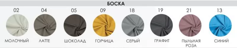 Grand Желтый 560, Grand Океан 675, Grand Темно-зеленый 698, Grand Латте 236, Grand Серый 900, Grand Розовый 390, Grand Бежевый 111, Nova Бирюза 300, Nova Океан 140, Nova Оливковый 089, Nova Коричневый 085, Nova Бордо 200, Nova Темно-серый 610, Nova Светло-серый 600, Nova Бежевый 910, Nella Оливковый 170, Nella Синий 145, Nella Бирюза 142, Nella Пыльная роза 115, Nella Бежевый 112, Nella Зеленый 089, Nella Океан 088, Nella Шоколад 075, Nella Графит 061, Nella Серый 040
