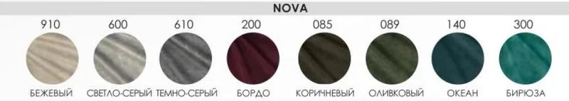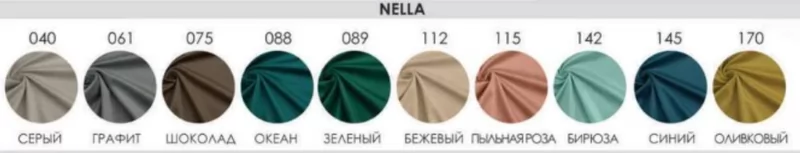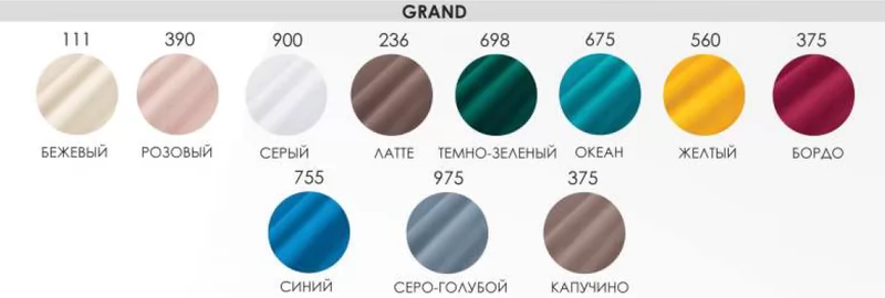 Grand Желтый 560, Grand Океан 675, Grand Темно-зеленый 698, Grand Латте 236, Grand Серый 900, Grand Розовый 390, Grand Бежевый 111, Nova Бирюза 300, Nova Океан 140, Nova Оливковый 089, Nova Коричневый 085, Nova Бордо 200, Nova Темно-серый 610, Nova Светло-серый 600, Nova Бежевый 910, Nella Оливковый 170, Nella Синий 145, Nella Бирюза 142, Nella Пыльная роза 115, Nella Бежевый 112, Nella Зеленый 089, Nella Океан 088, Nella Шоколад 075, Nella Графит 061, Nella Серый 040
